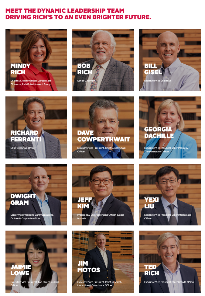 Obitelj Rich nije nepoznata. Na čelu joj je Robert E. Rich Jr., nasljednik osnivača i dugogodišnji prvi čovjek kompanije. Njegovu najužu poslovnu i obiteljsku jezgru čine ljudi koji su godinama jasno vidljivi u strukturi kompanije.