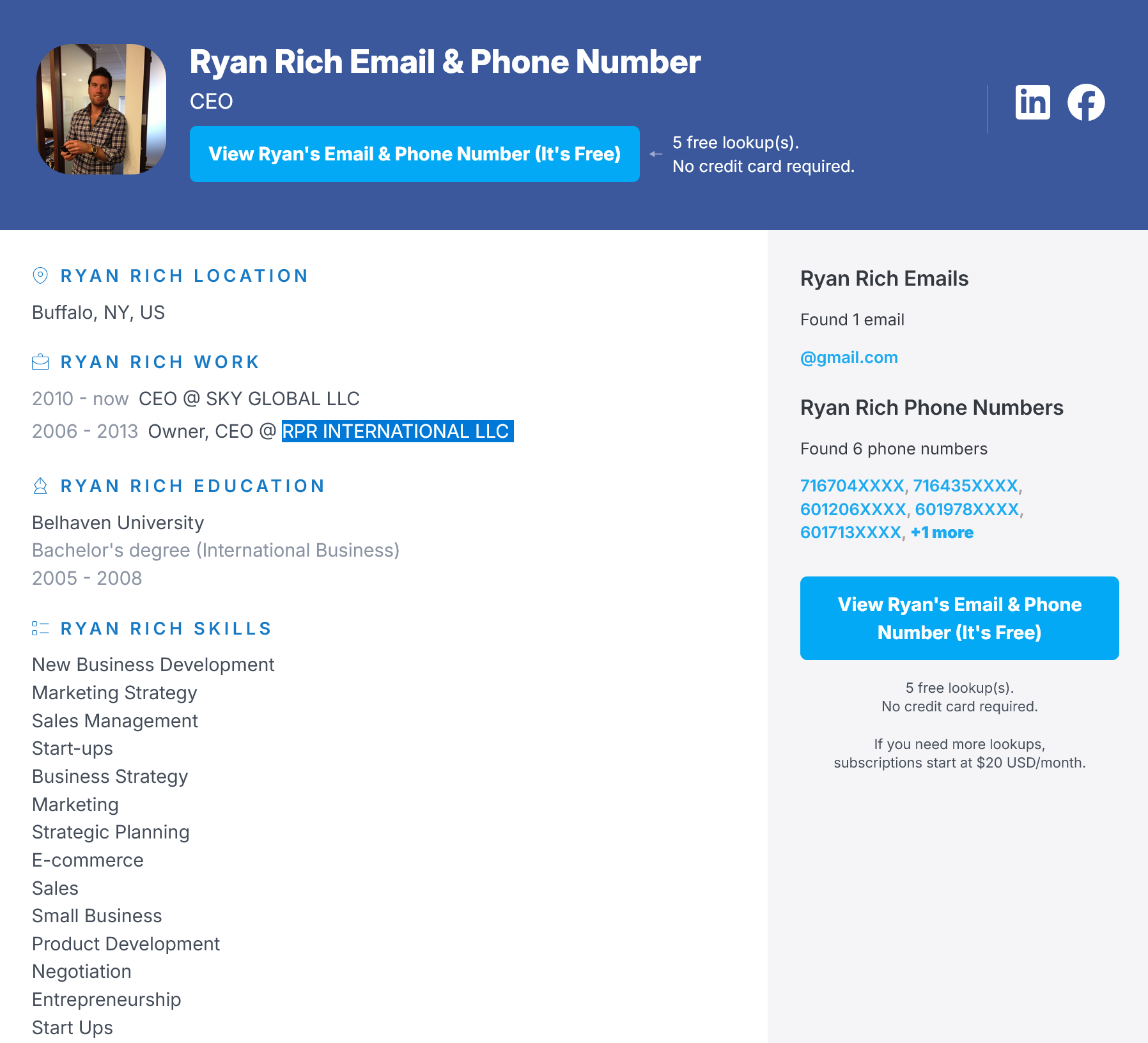 Dodatni uvid dolazi iz javnih registara u SAD-u. Tvrtka Sky Global LLC, povezana s Ryanom Richem, registrirana je kao mala privatna firma iz Amhersta kod Buffala, u sektoru trgovine nakitom i dragim kamenjem.